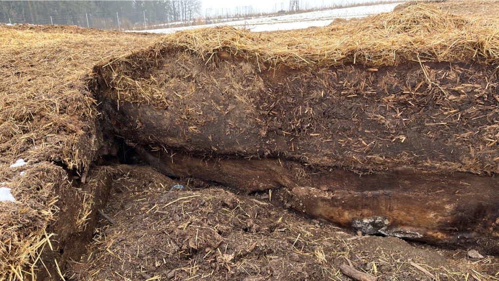 Nach der Mast bleibt eine circa ein Meter hohe Mist-Stroh-Matte zurück, die bereit für die Kompostierung ist.