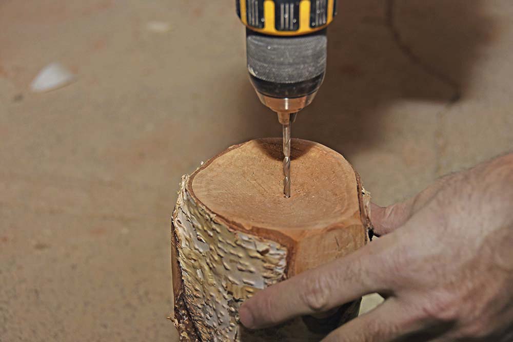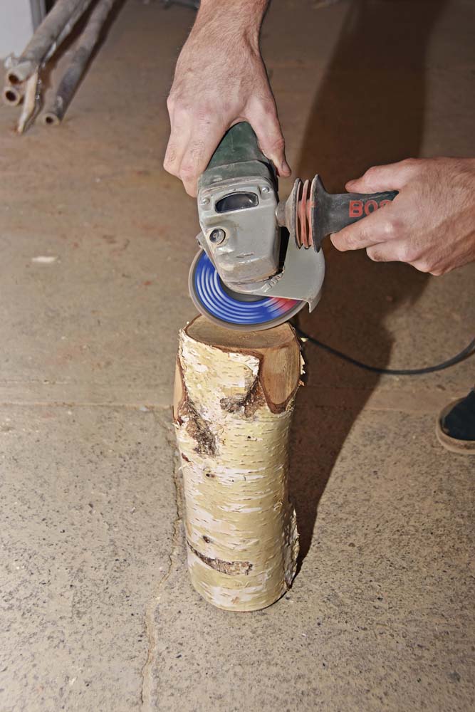 1| Aus einem Birkenstamm verschieden lange Holzstücke herunterschneiden. Auf einer Seite des Holzstückes mit dem Winkelschneider eine Mulde formen.