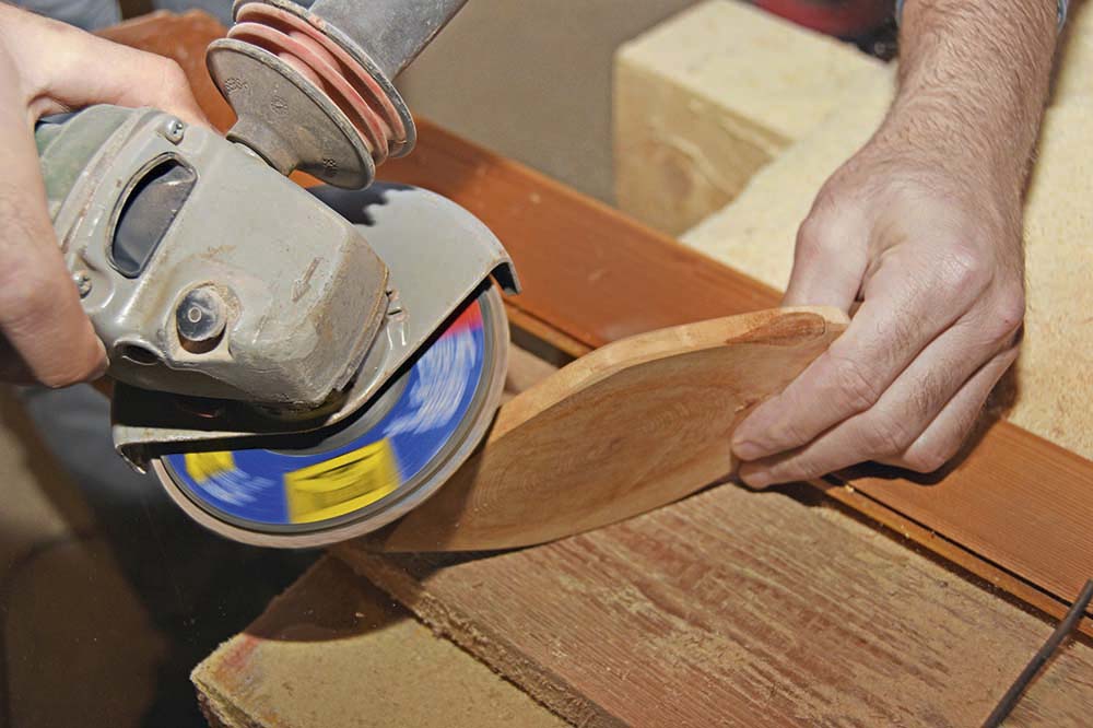 2| Für die „Flamme“ eignet sich Kirschenholz, da dieses verschiedene Marmorierungen hat. Aus einem Aststück sehr schräge Holzstücke herunterschneiden, damit man die ovale Form bekommt. Rinde mit dem Winkelschleifer entfernen.