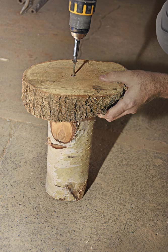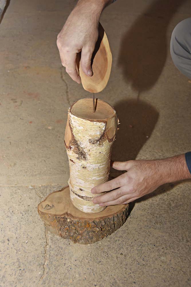 4| Für den „Kerzenständer“ etwa zehn Zentimeter breite Scheiben eines beliebigen Holzes herunterschneiden und Ständer mit der Kerze verschrauben.
