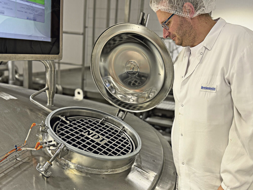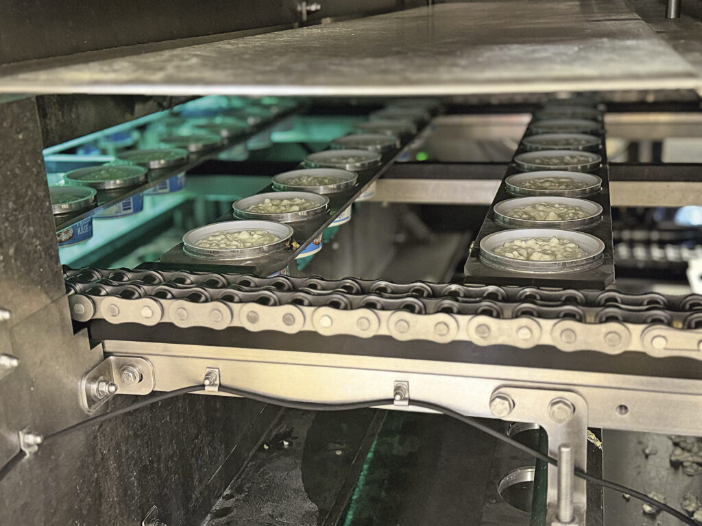 6) Der fertige Cottage Cheese wird unter hygienischen Bedingungen abgefüllt, verpackt und macht sich auf den Weg in die Kühlregale der Supermärkte.