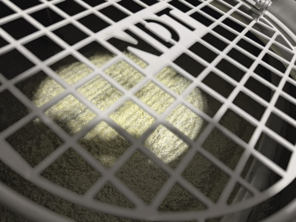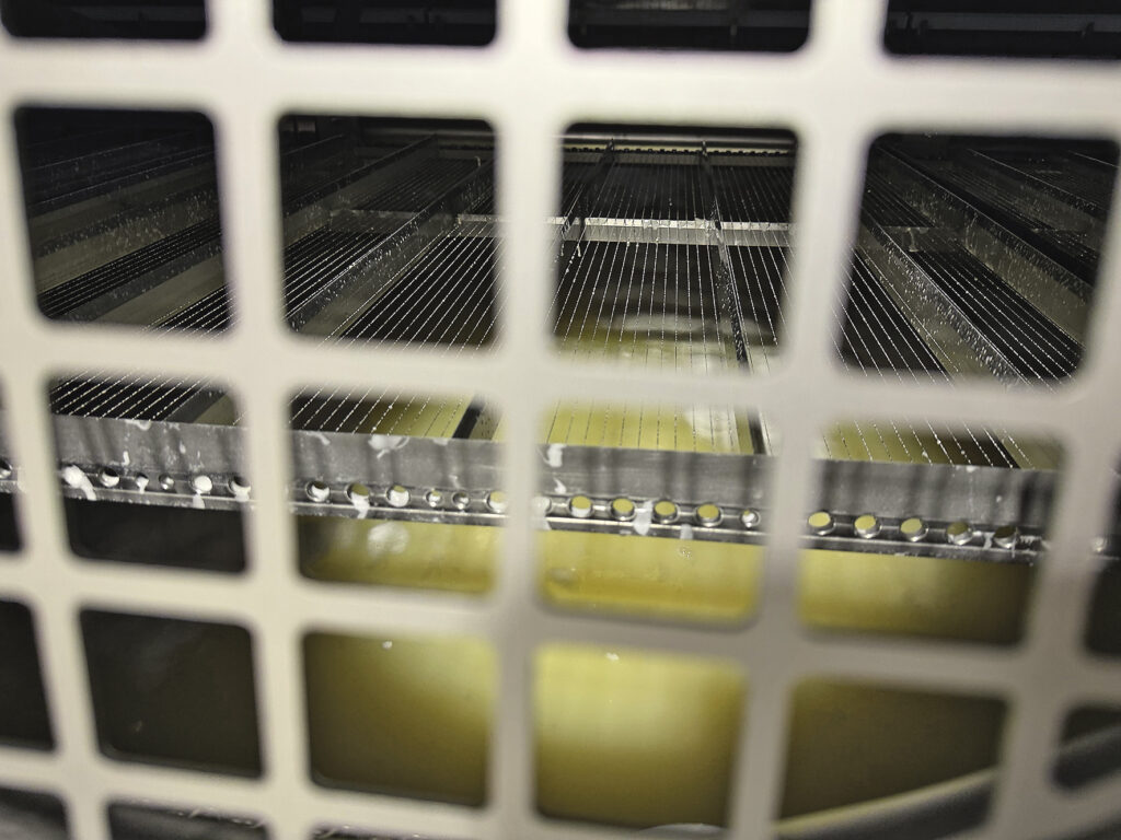 3) Die entstandene Gallerte wird in kleine Würfel geschnitten. Dadurch tritt Molke aus und die charakteristische körnige Struktur entsteht.