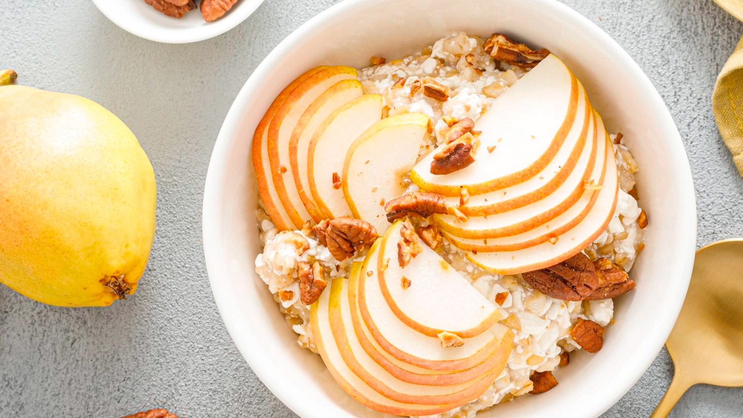 Eine Birne schälen, entkernen und in kleine Stücke schneiden. Gemeinsam mit den Sonnenblumenkernen und dem Leinöl unter den Cottage Cheese mischen. Die Mischung auf zwei Schüsseln aufteilen. Die zweite Birne entkernen und in Scheiben schneiden. Die Pekan- oder Walnüsse grob hacken. Mit Birnenscheiben und Nüssen anrichten und gleich genießen.