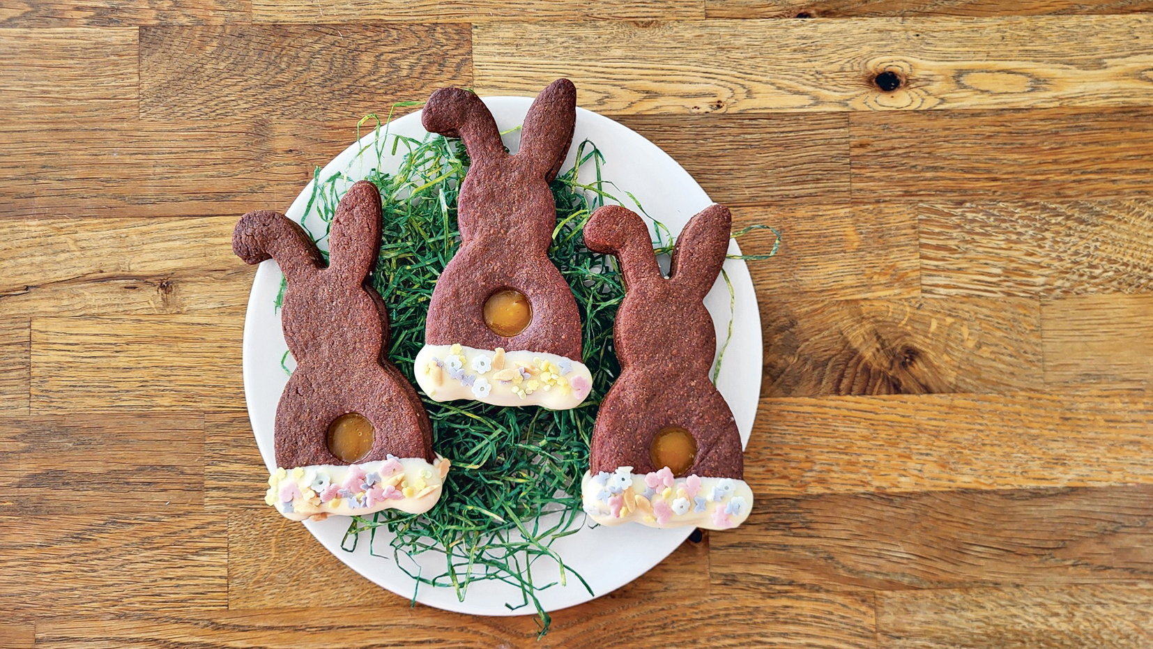 Alle Zutaten zu einem glatten Mürbteig kneten und in Frischhaltefolie gewickelt ungefähr eine halbe Stunde im Kühlschrank rasten lassen. Den Teig auf einer bemehlten Arbeitsfläche nicht zu dünn ausrollen und daraus mit Ausstechern in Hasenform Kekse ausstechen. Bei jedem zweiten Keks einen kleine runde Öffnung ausstechen. Im vorgeheizten Backrohr (Heißluft, circa 180 Grad) auf Sicht backen (circa 10 Minuten). Ausgekühlt mit Marmelade zusammensetzen, danach in weiße Kuvertüre tunken und mit beliebigem Dekor bestreuen.
