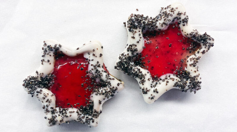 Auf einer bemehlten Arbeitsfläche den Teig circa 3 mm dünn ausrollen. Beliebige Form ausstechen und für die Deckel, die Hälfte mit Loch in der Mitte stechen. Bei 220 °C (O/U) circa 5 Minuten backen (bis der Rand leicht braun wird). Böden mit beliebiger Marmelade füllen. Die Deckel in die Glasur tauchen und auf die Böden setzen. Die noch feuchte Glasuur mit Mohn bestreuen.