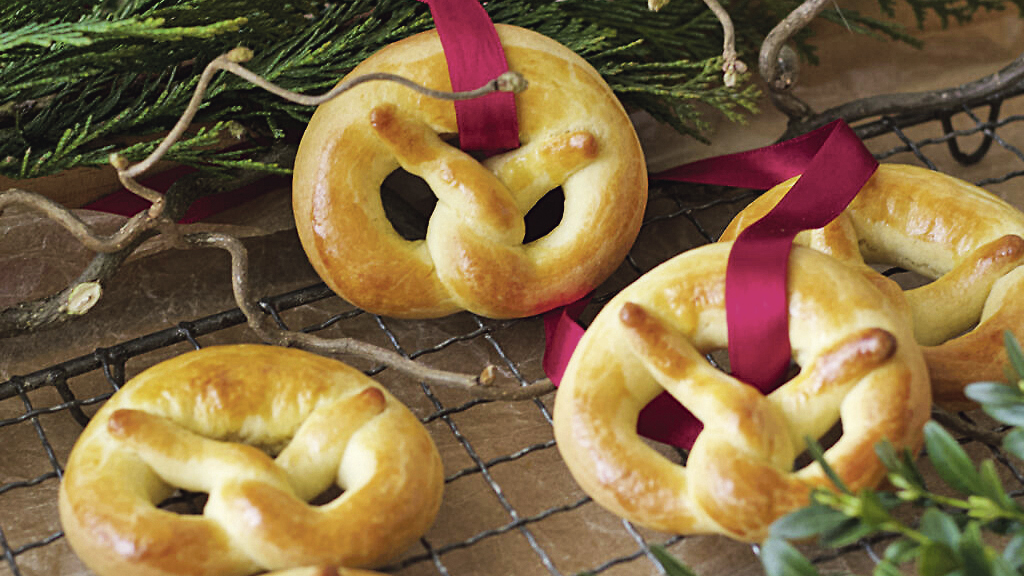 Anschließend jede Kugel zu einem 25 bis 30 cm langen dünnen Strang formen. Die Mitte sollte dicker bleiben, der Strang zu den Enden hin dünner werden. Brezeln formen, auf ein Blech legen und wieder 10 Minuten rasten lassen.