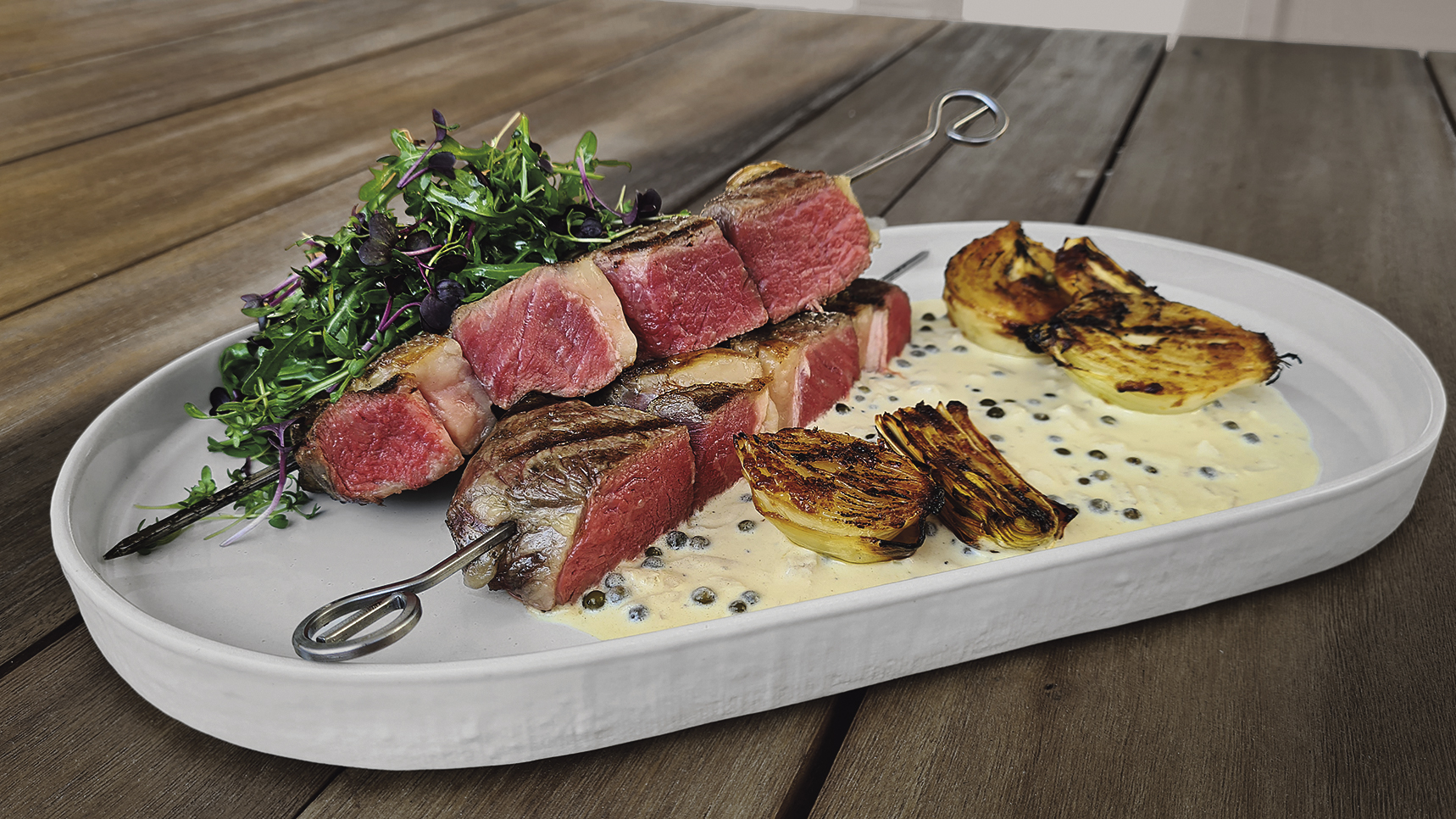 Das Steak in etwa 3 bis 4 cm breite Tranchen schneiden und mit zwei Spießen im Abstand von circa 4 cm aufspießen. Die Spieße salzen, auf jeder Seite etwa 2 Minuten bei hoher Hitze kräftig angrillen/anbraten. Dann circa 20 Minuten bei 120°C indirekter Hitze ziehen lassen (Kerntemperatur: 53°C für medium-rare). Zum Schluss den fertigen Spieß der Länge nach zwischen den beiden Spießen durchschneiden, sodass zwei einzelne Spieße entstehen.