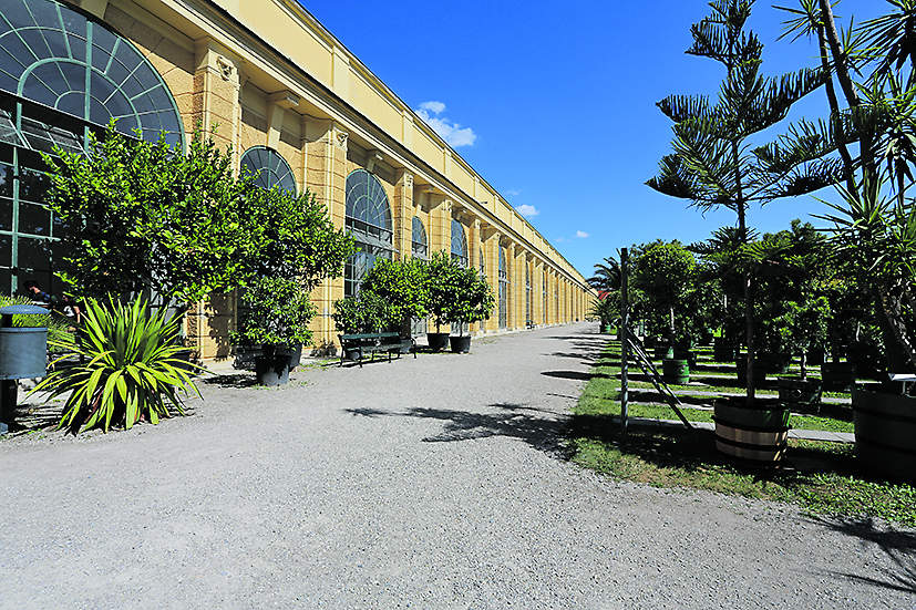■ Sogenannte „Orangerien“ (im Bild jene von Schloss Schönbrunn in Wien) zum Überwintern kälteempfindlicher Kübelpflanzen aus Parkanlagen tauchten erstmal im viktorianischen Zeitalter auf. Daraus entwickelten sich die Ausstellungsräume botanischer Gärten, bis schließlich der Mensch den Wintergarten als Wohnraum für sich entdeckte.