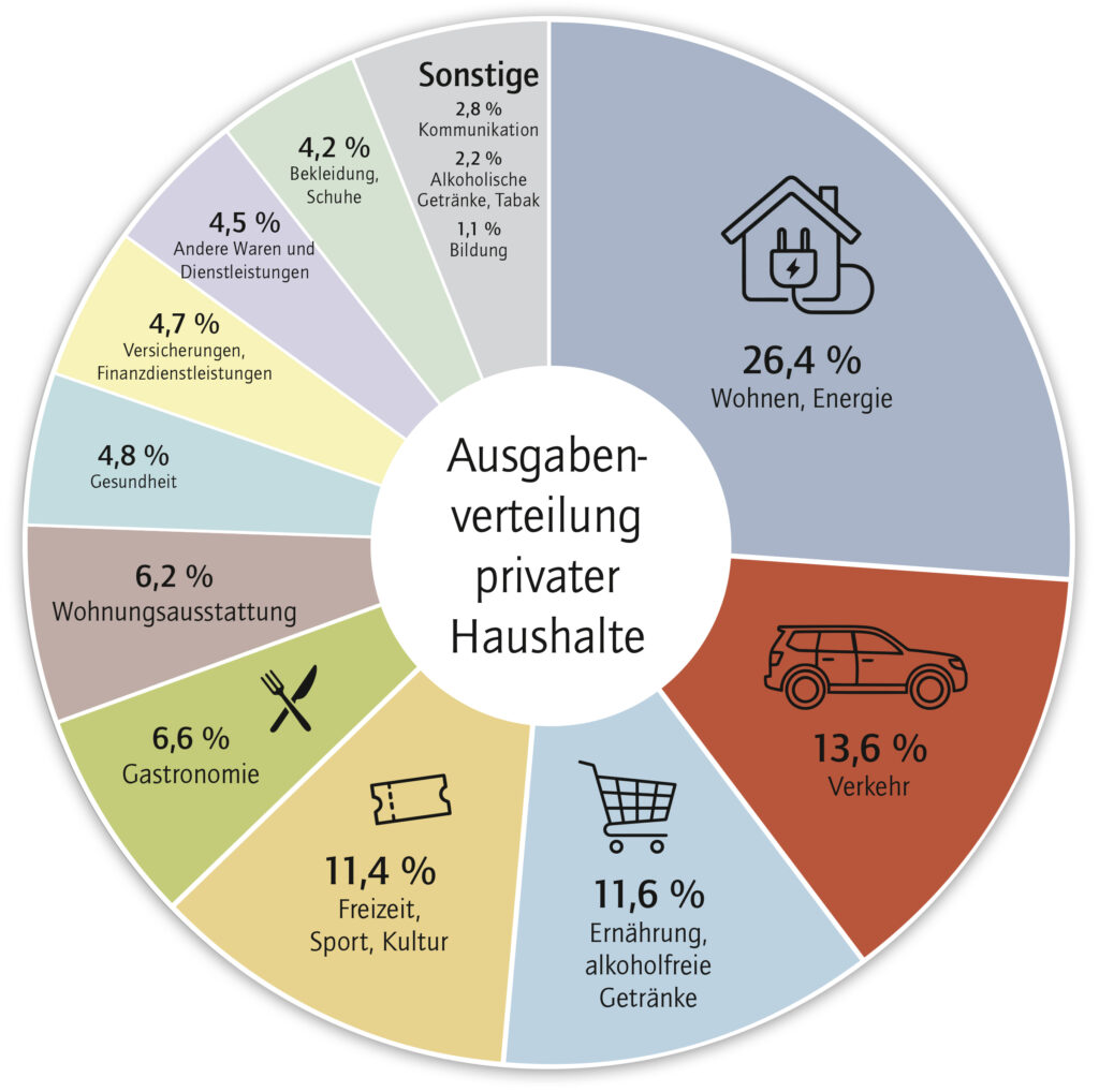 Deutliche Differenzen zeigen sich auch je nach verfügbarem Einkommen. Im untersten Zehntel der Haushalte machen Ausgaben für Wohnen und Energie 46,7 Prozent des Budgets aus, im obersten Zehntel hingegen nur 22,5 Prozent. Noch stärker ist die Spannweite im Bereich Freizeit, Sport und Kultur: Hier reicht der Anteil von 3,2 Prozent bei Haushalten mit geringem Einkommen bis zu 14,3 Prozent bei jenen mit dem höchsten Monatsbudget.