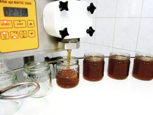 7. Nachdem der Honig von Wachsteilen und verunreinigungen durch ein Sieb gereinigt worden ist, wird er in Gläser abgefüllt. Cremehonig ist gerührter kristalliner Honig.