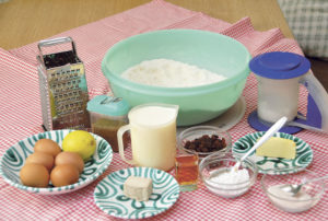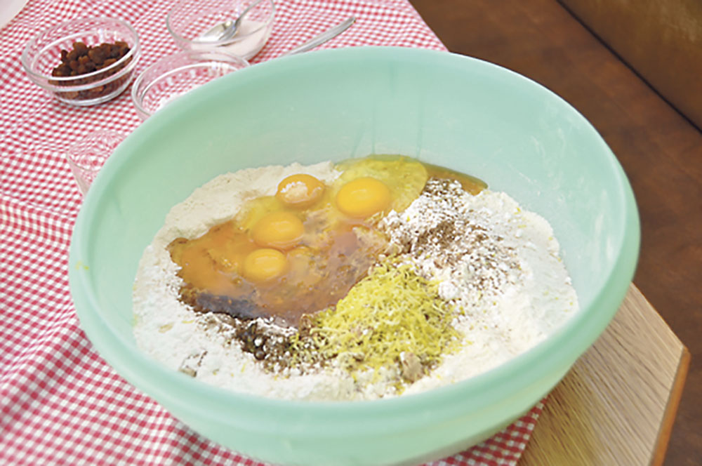 3. Trockene Zutaten, Germ, Flüssigkeitsgemisch, Rum und Zitronenschale vermengen.