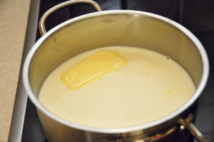 2. Milch in einem kleinen Topf erwärmen und Butter darin schmelzen.