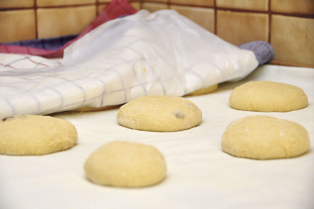 7. Die Laibchen bemehlen, auf ein bemehltes Tuch setzen und warm zugedeckt nochmals gehen lassen, solange bis der Teigling zirka doppelt so groß ist als zuvor.