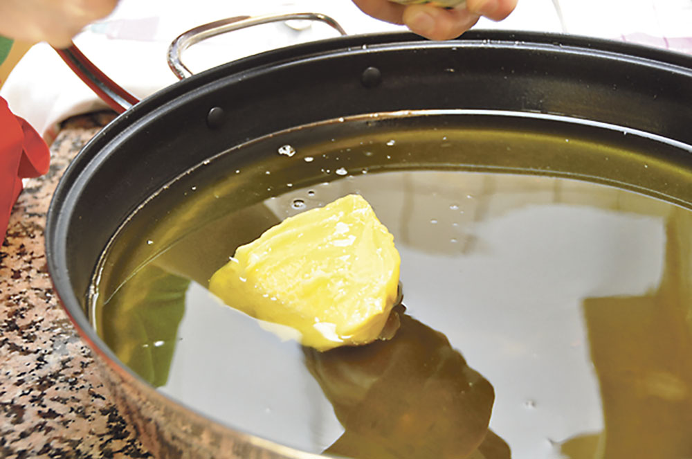 8. Butterschmalz oder Schweineschmalz erhitzen, Temperaturprobe mit Teigstück machen.