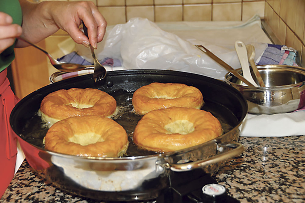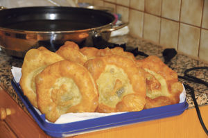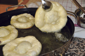 10. Den Teigling ins heiße Schmalz legen. Mit einem Löffel kurz vor dem Wenden heißes Fett ...